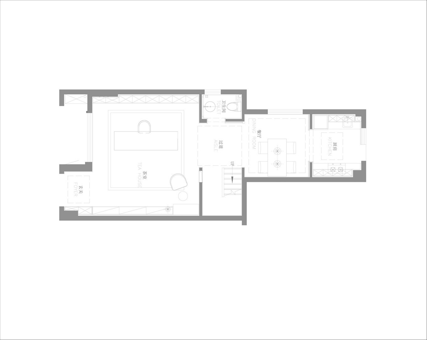 原本強勢切割客、餐廳的大樑,透過天花加寬、降低修飾拉出餐廳尺度。