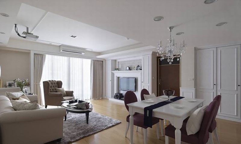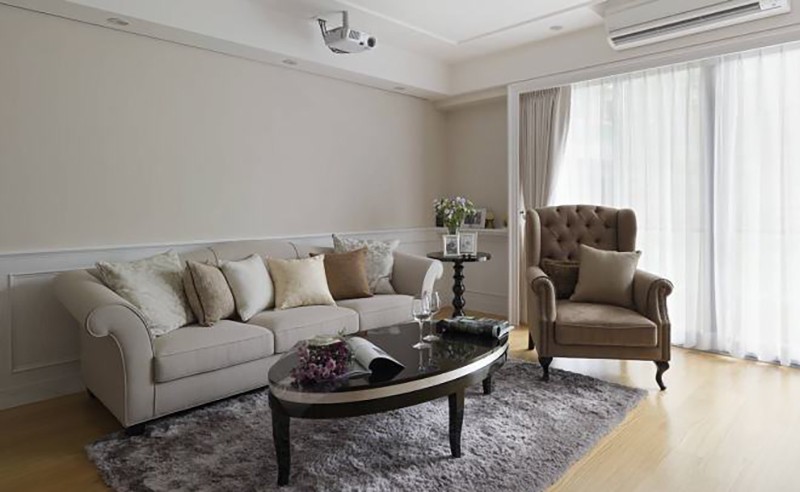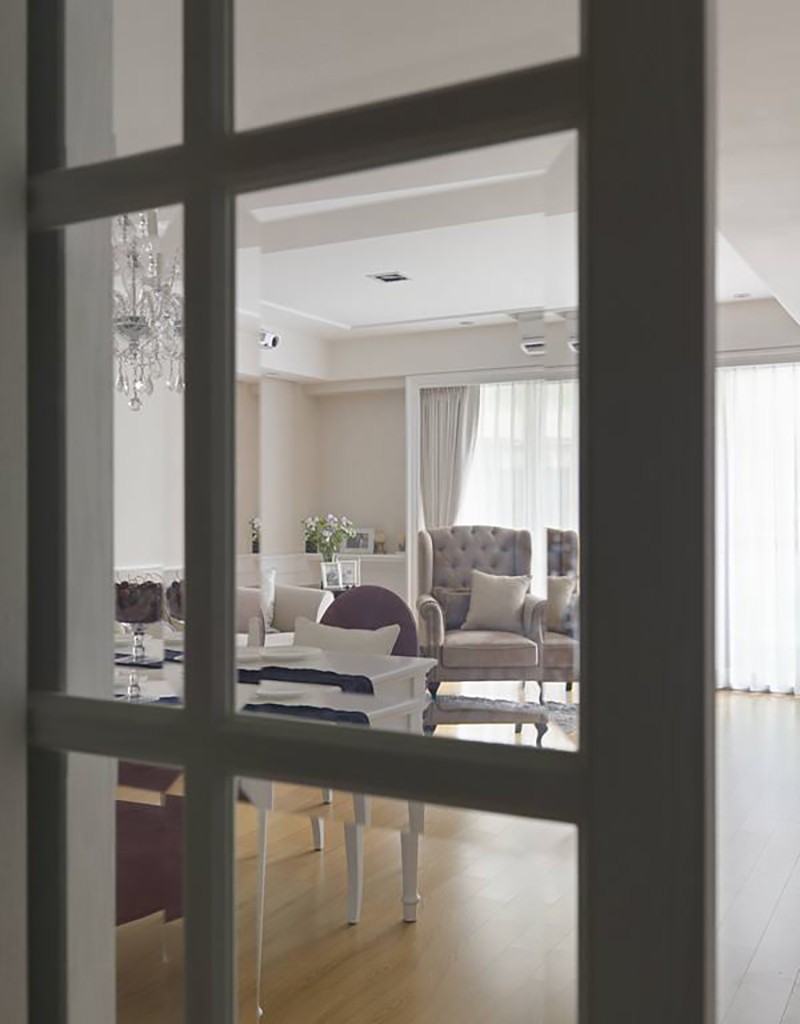 為了修飾社區中鋁框的不協調,利用白色古典窗框佐以經典白紗與窗簾,完整客廳古典情調。