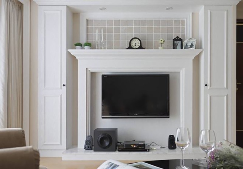 客廳電視主墻處,壁爐是英式與美式風格中不可或缺的元素,灰白色復古磚拼接展現了屋主淡雅自然性格,兩側對稱性的線條界定,收住了飽滿收納。