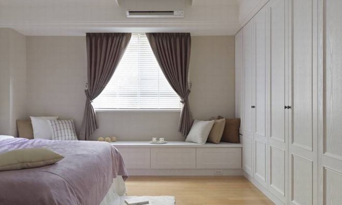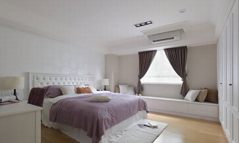 白色及美式風格延伸來到主臥房空間,在不動格局的考量下,設計師利用床尾衣柜及窗邊平檯滿足了收納,拉出一進門的步伐景深。