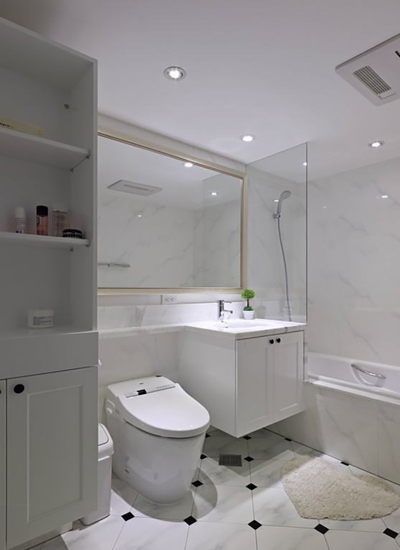 衛浴部份黑白磁磚交貼與不落地浴柜設計,連衛浴都有了美好比例。