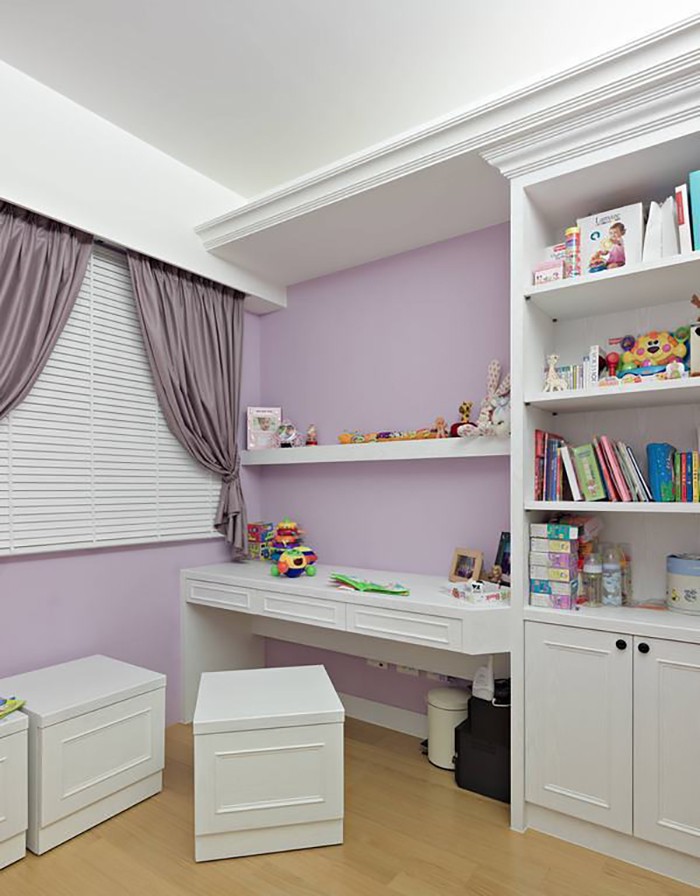 化妝臺、書桌、衣柜與床頭板的做入,成長中只需透過軟件和漆色轉換,就可隨著年齡變化出最適切的風格需求。